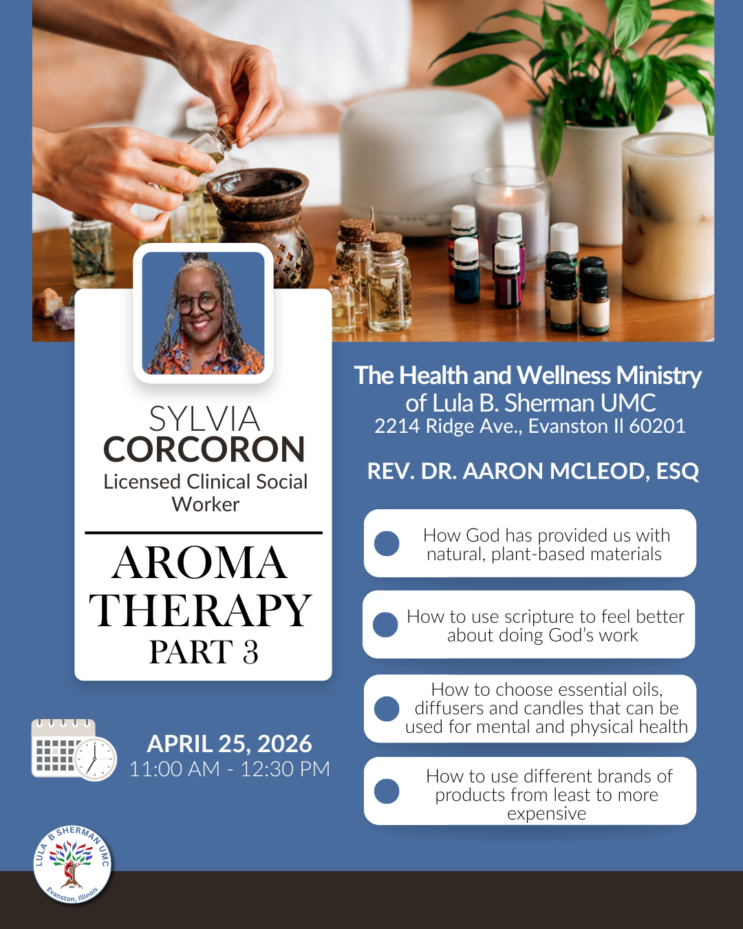 Aromatherapy Session Saturday, April 25, 2026 11:00 AM 12:30 PM Lula B. Sherman United Methodist Church 2214 Ridge Avenue Evanston, IL, 60201 United States (map) Google Calendar ICS The Health and Wellness Ministry and Sister Sylvia Corcoron, Licensed Clinical Social Worker, will lead us in exploring how plant-based gifts from God’s creation can support our mental and physical well-being.