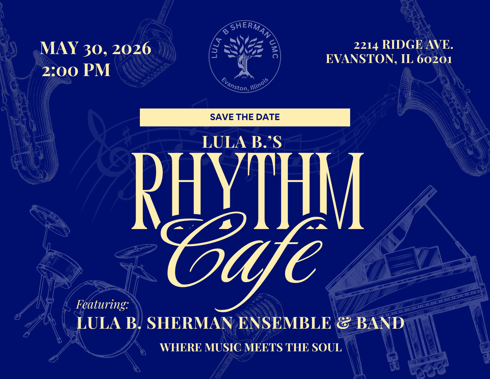 Back to All Events Lula B.'s Rhythm Cafe Saturday, May 30, 2026 2:00 PM 5:00 PM Lula B. Sherman United Methodist Church 2214 Ridge Avenue Evanston, IL, 60201 United States (map) Google Calendar ICS The rhythm is calling! Save the date for Lula B.'s Rhythm Cafe, featuring the Lula B. Sherman Ensemble and Band, on Saturday, May 30, 2026 at 2:00 PM. You do NOT want to miss this one, so mark your calendars and stay tuned for more details.